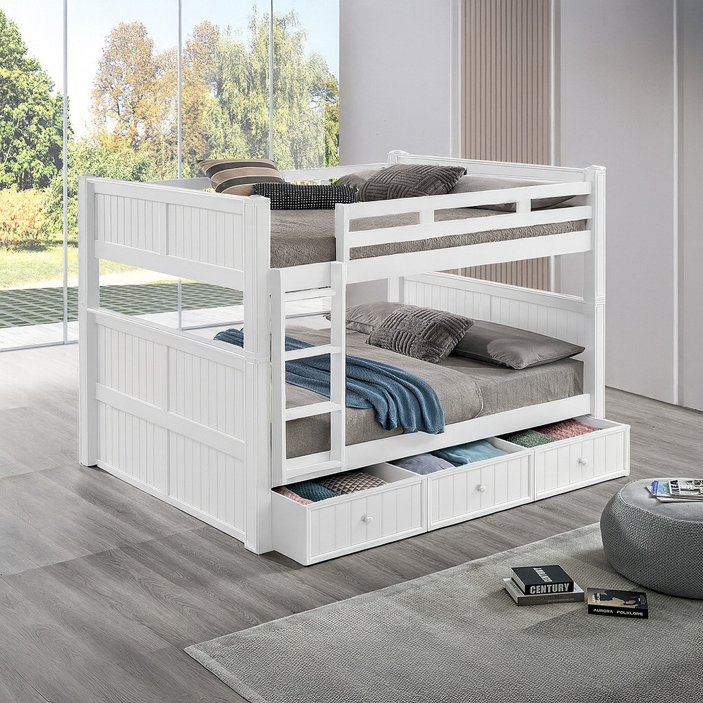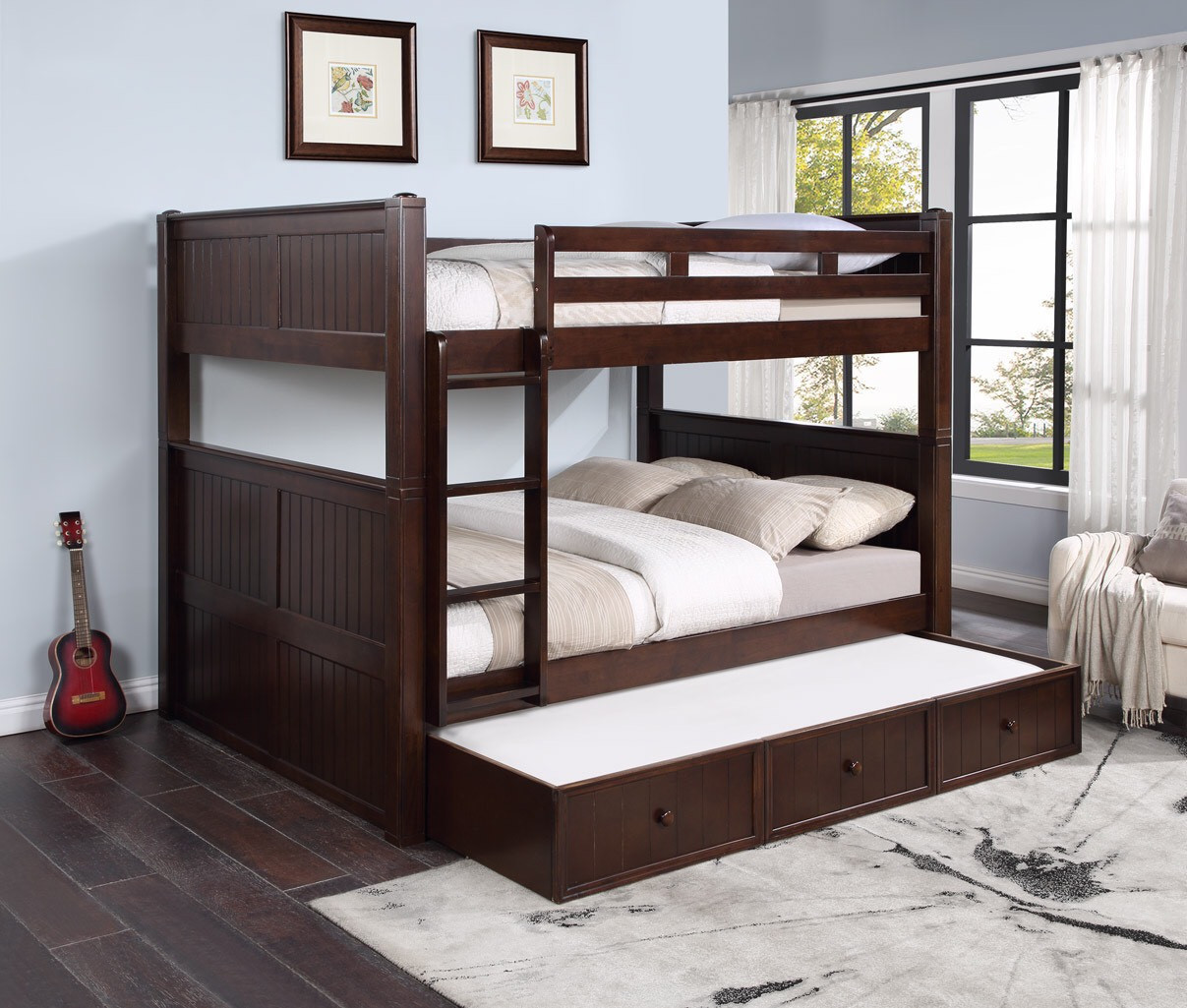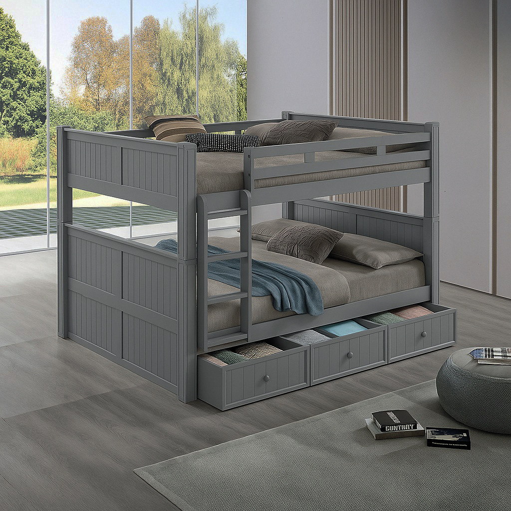 Loading... Please wait...The Dillon Queen size bunk bed will be a great addition to your home or cabin. Whether you are seeking space saving features or simply looking for something different, the Dillon line is a perfect choice. The upper bed features full length guard rails, under bed slat support system, and a convenient ladder with 3" wide grooved steps for safe passage to the top unit. With its solid hardwood frame, the construction of the bunk is both durable and long lasting. With a variety of finishes to choose from, pick the perfect finish to complement you cabin or vacation home. To increase the sleeping capacity add a twin XL or full XL trundle.