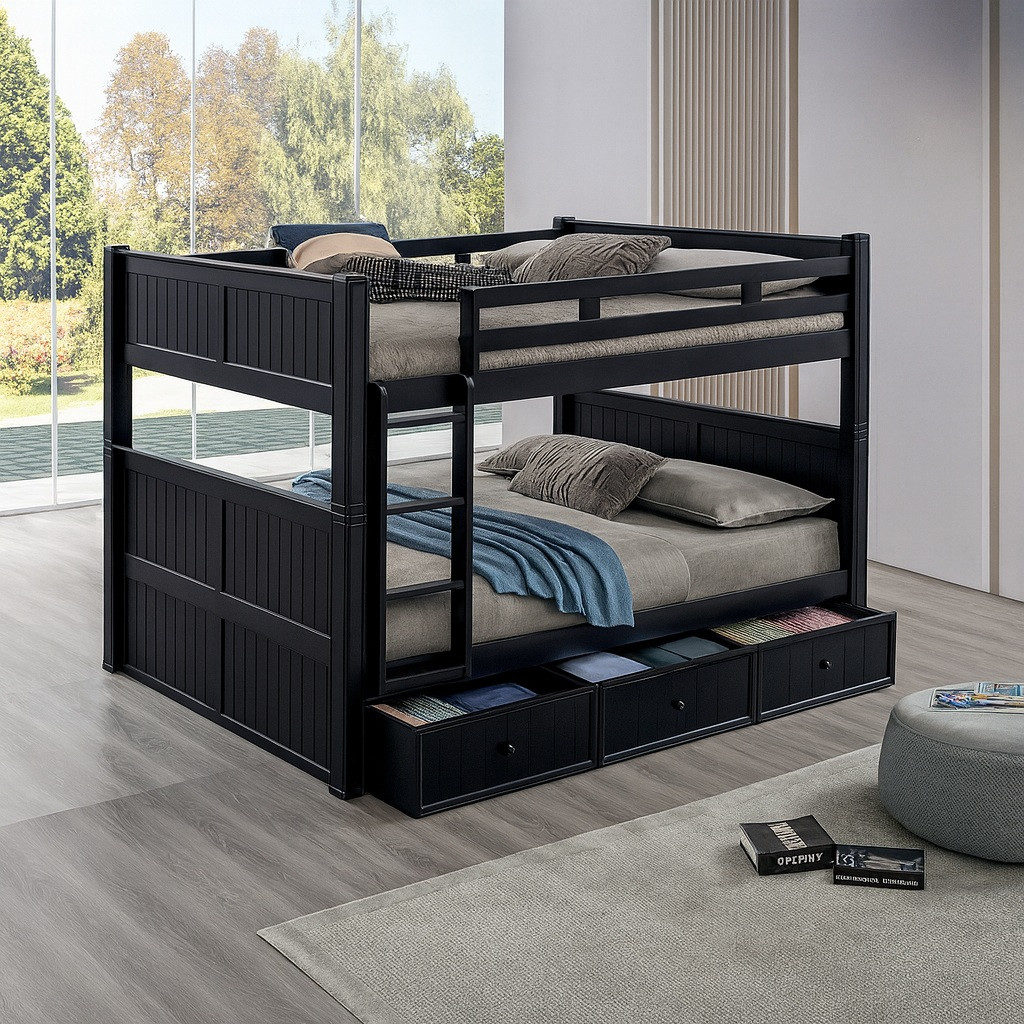 Searched long and hard for a sturdy adult queen over queen bunk bed. This bed is well built. No movement at all from people in top bunk. The navy blue color matches decor perfectly.